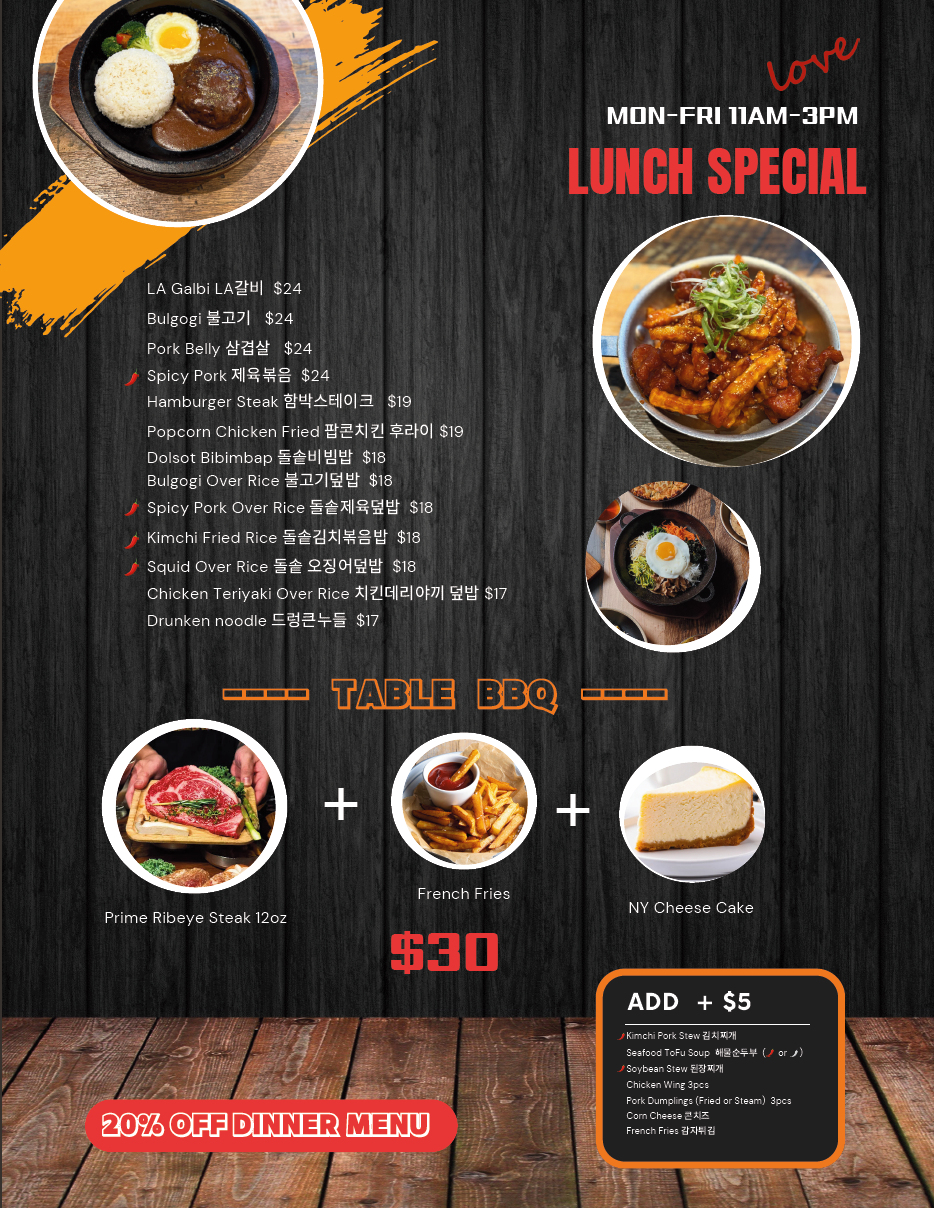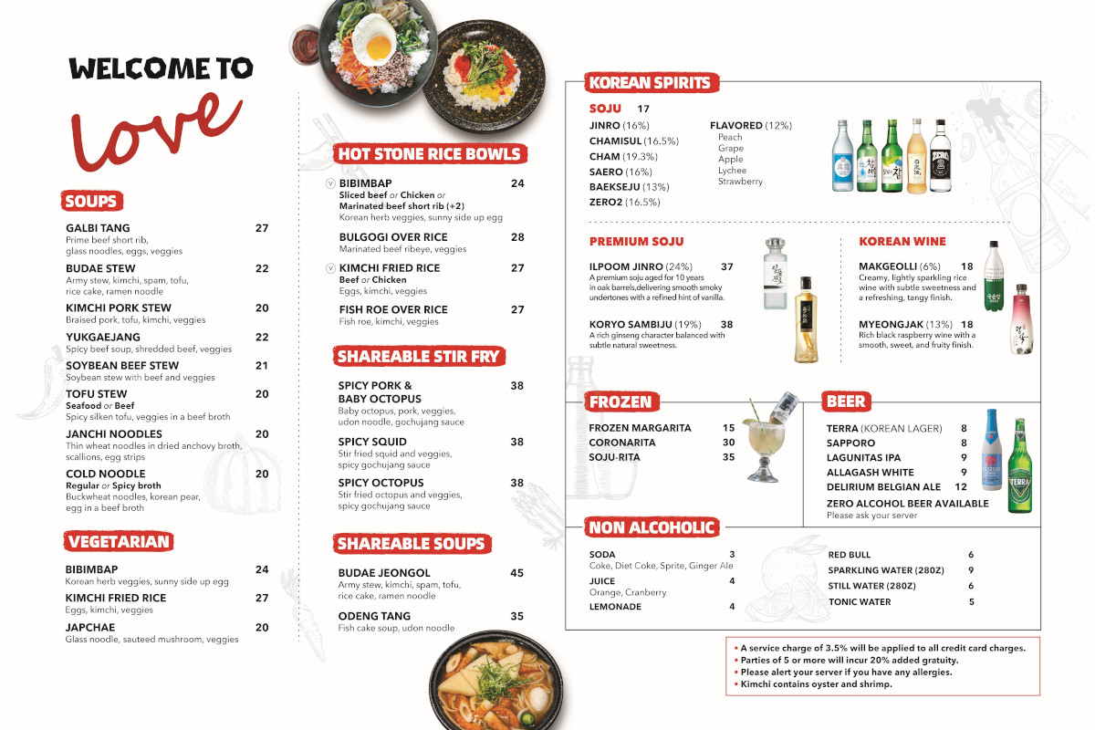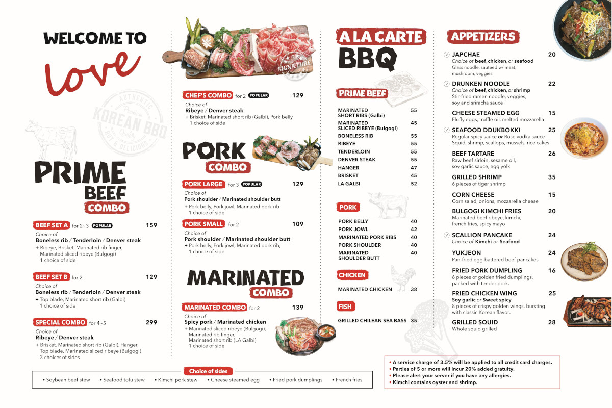 beef set & pork set options with kimchi stew, soybean stew and seafood tofu stew / all you can eat